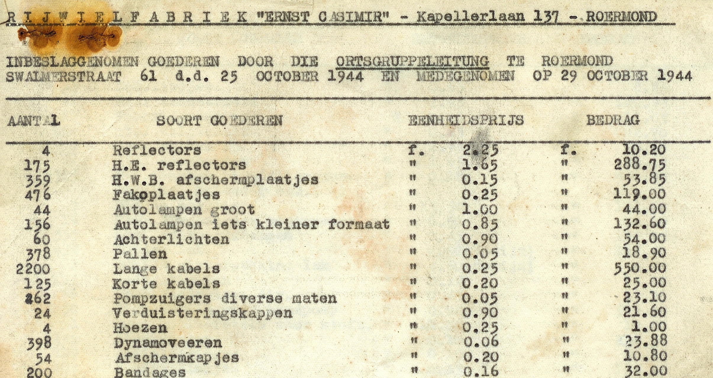 Intussen hadden de bedrijven opdracht gekregen om alle aanwezige goederen te inventariseren. Men vreesde dat de Duitsers de goederen zouden ophalen en zo gebeurde het ook. De rijwielfabriek op de Kapellerlaan was een van de getroffen bedrijven. Alles wat in beslag genomen werd was nauwkeurig op een lijst ingevuld, maar de rijwielfabriek had er verder helemaal niets aan.